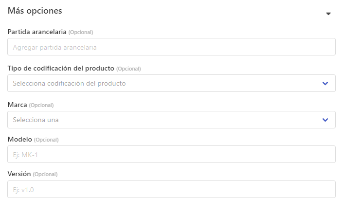 Más opciones: Configura detalles adicionales sobre el producto, como: