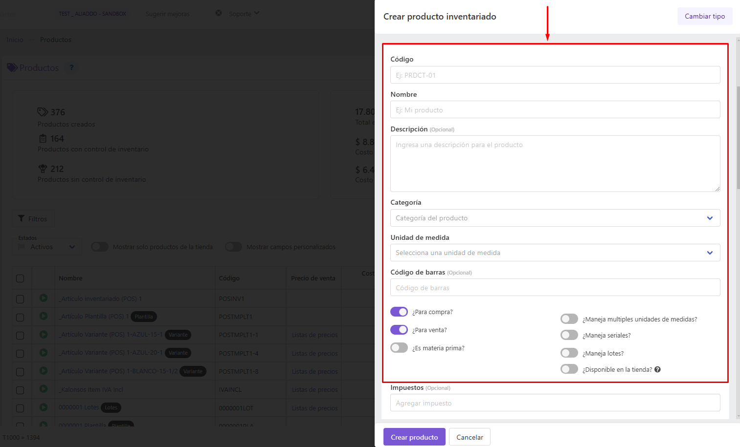 Finalmente, haz clic en Crear producto para registrar tu producto inventariado.