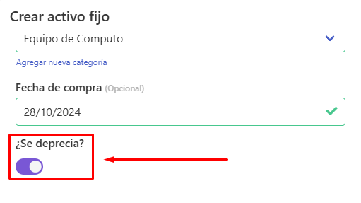 Categoría: Selecciona la categoría del activo fijo que creaste previamente. ➣ ¿Cómo crear categorías de activos fijos?