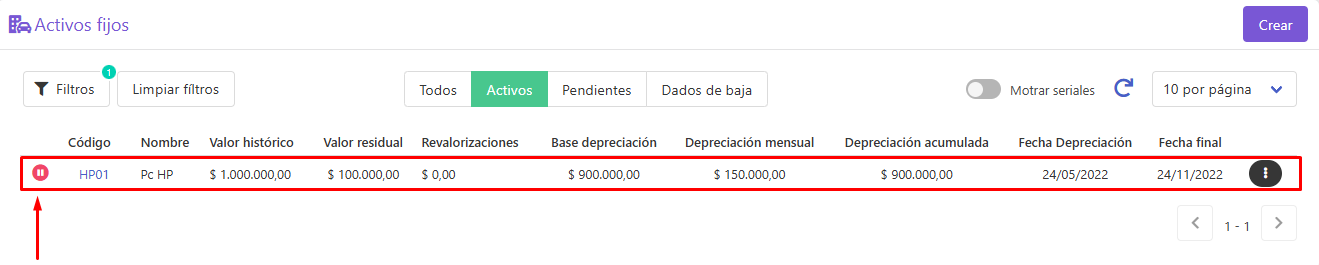 Una vez que hayas encontrado el activo fijo que deseas dar de baja, haz clic en el botón de Acciones (tres puntos) a la derecha del registro del activo.